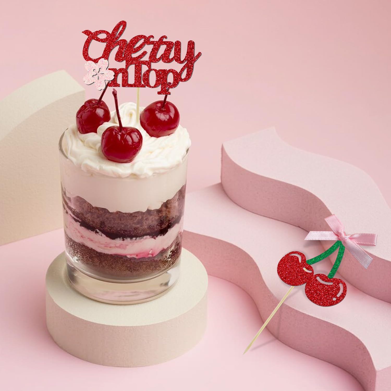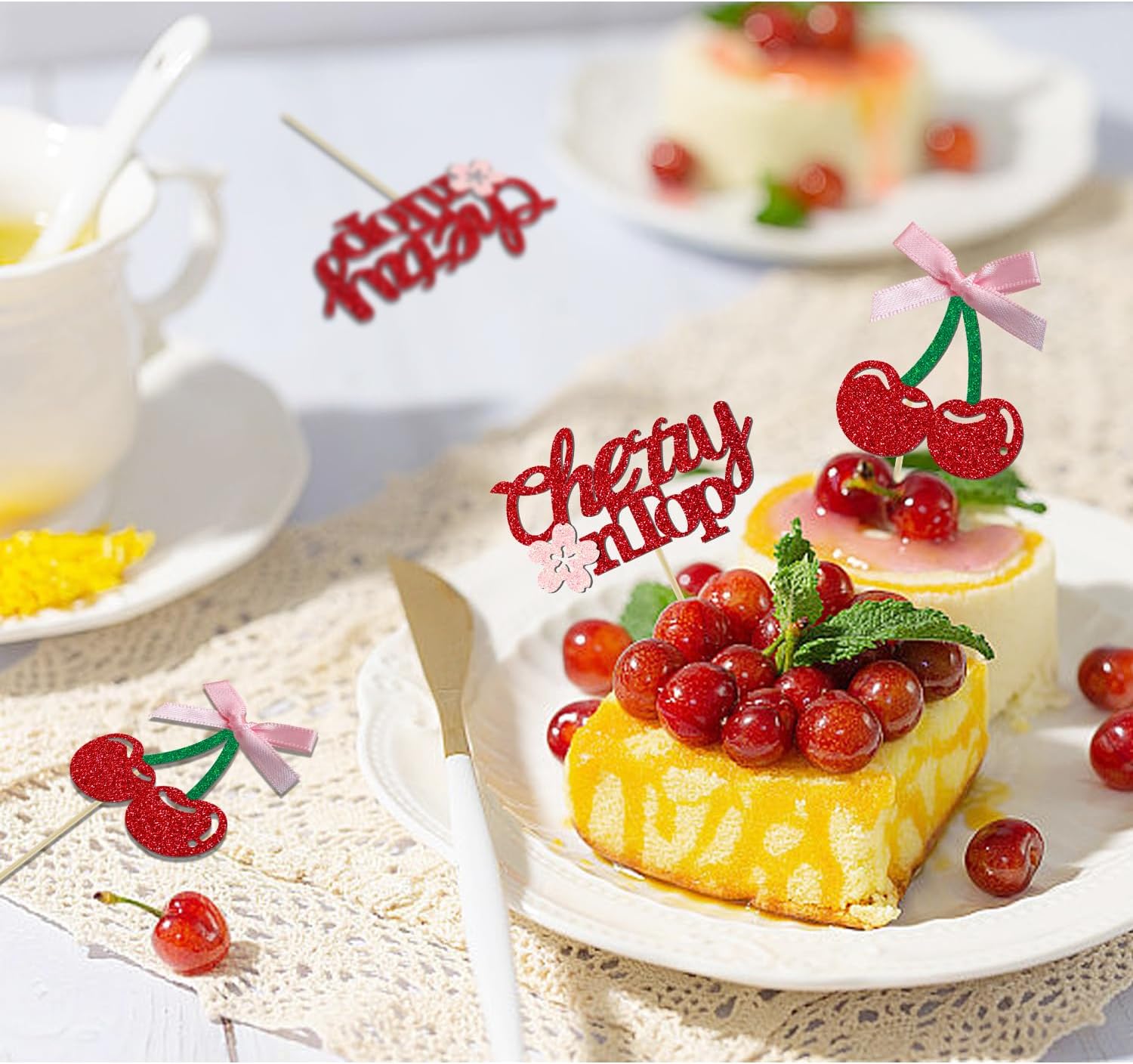 - 【Cherry Cake Topper】:These sparkling and cute cake decorations are excellent accessory for cherry or fruits party. The top features a unique cherry design, with cherries paired with satin bows that stand out and add extra radiance and cuteness. These cherry cake toppers will make your cake more attractive and everyone will love it! It's also a great photo prop to make your party more fun!