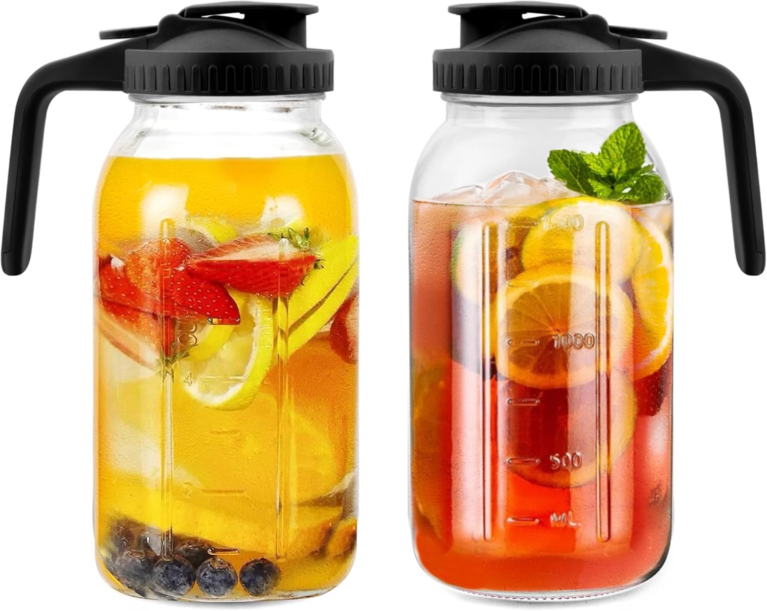 64oz Glass Pitcher with Lid-2 Quart, Heavy Duty Glass Mason Jar Pitcher 2 Packs, Leak-Proof Wide Mouth Jar with Pouring Airtight Lid, Ideal Container for Water, Juice, Milk and Drinks Storage