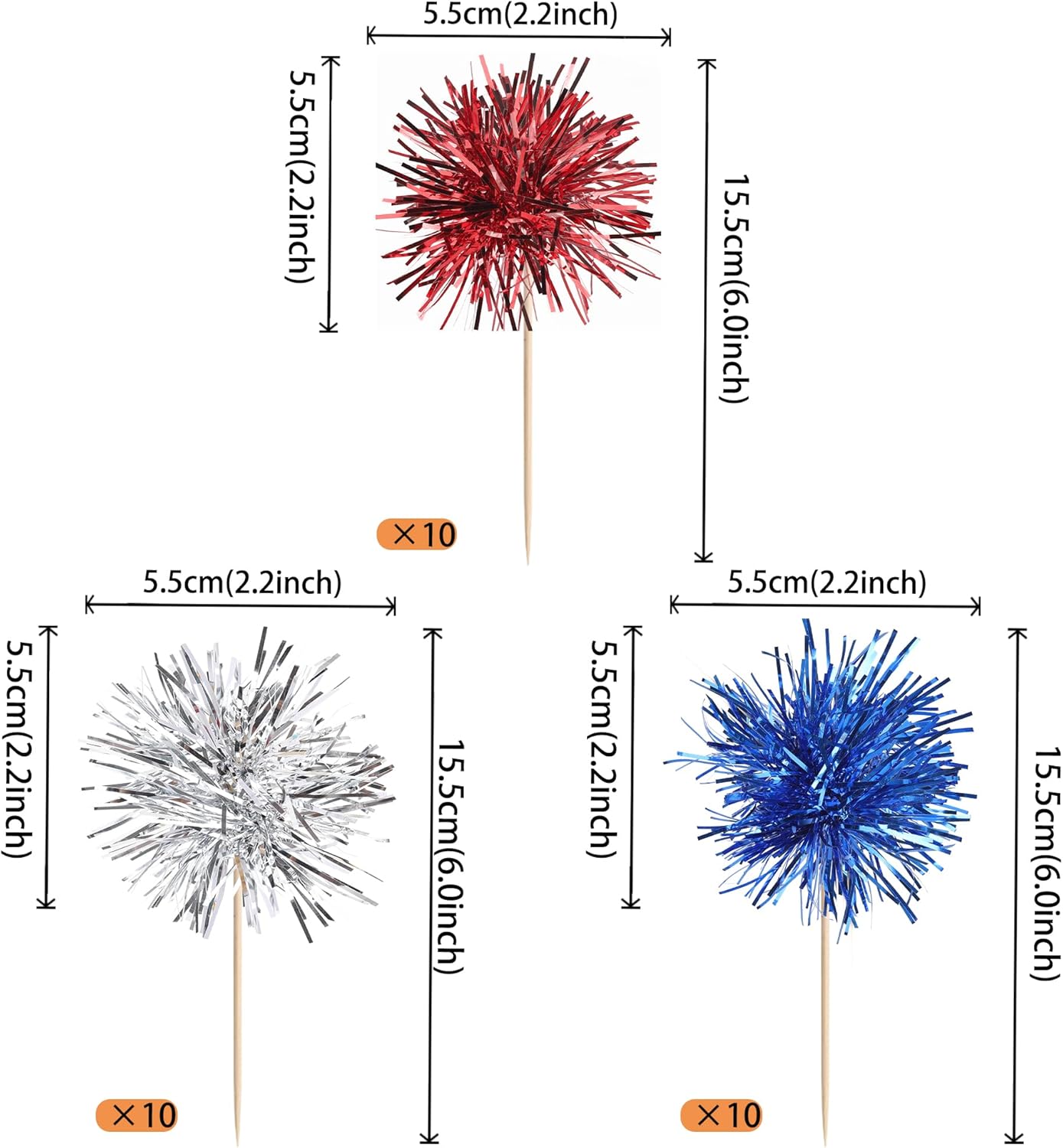 30 PCS Foil Firework Cupcake Toppers Sparkle Tinsel Cupcakae Picks 4th of July Decorations Cocktail Fruit Toothpick for Fireworks Theme Birthday Wedding Graduation Party Decor Supplies Blue Red Silver