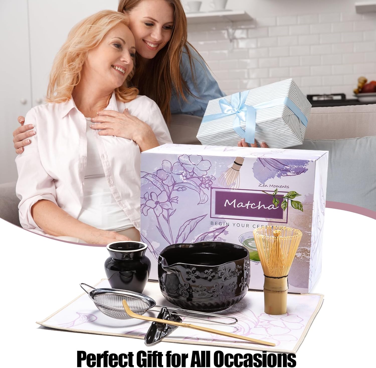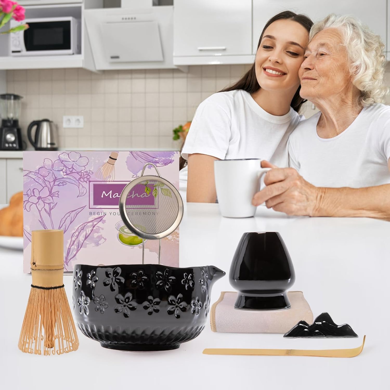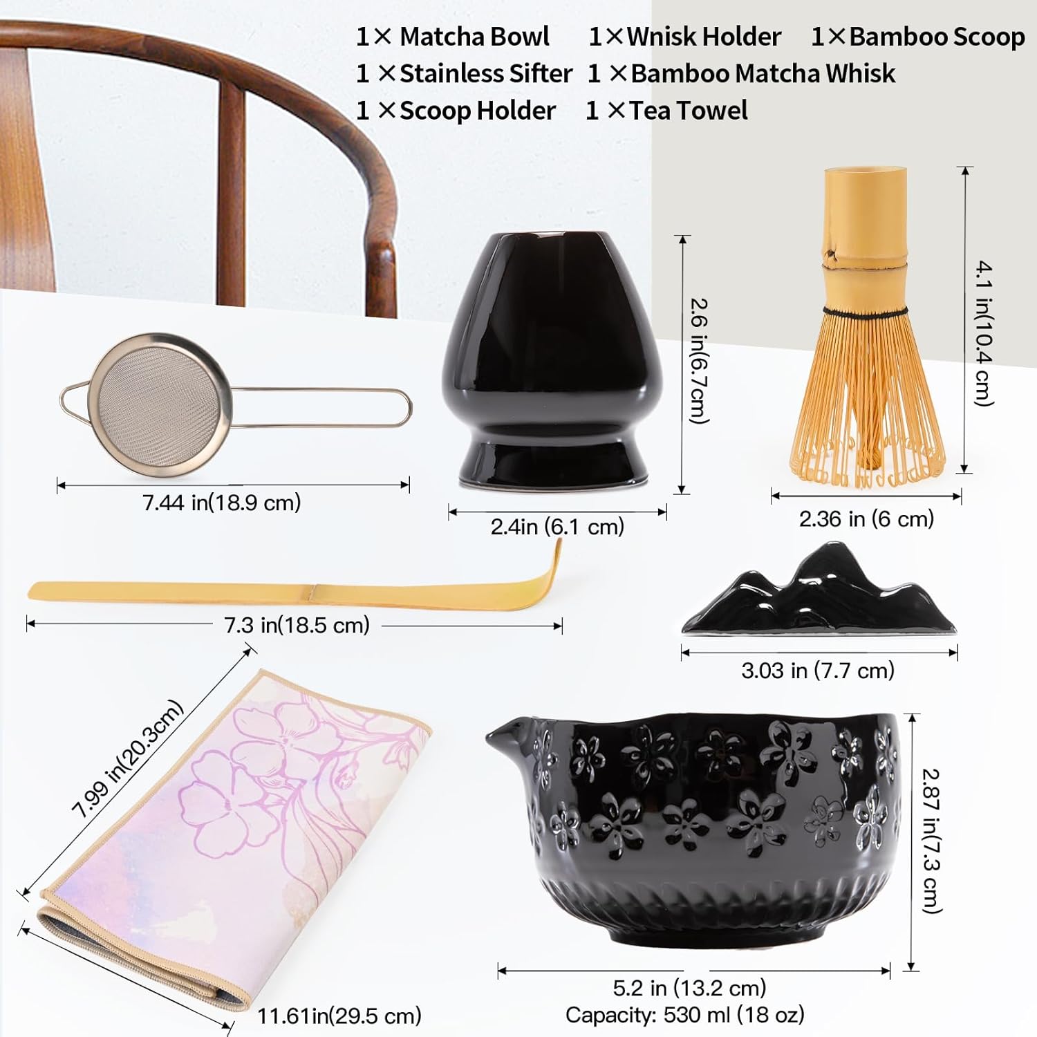 Matcha Whisk Set - Traditional Japanese Handmade Bamboo Matcha Whisk and Holder, Matcha Bowl,Bamboo Scoop, Scoop Rest, Sifter and Tea Towel (Black)