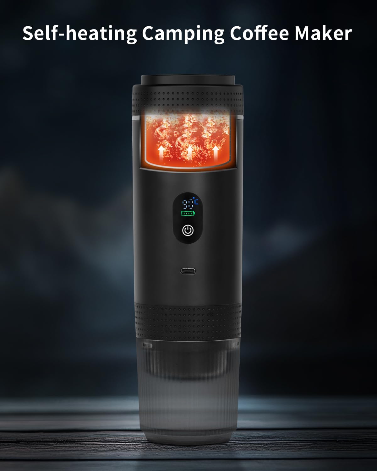 - Fast Self-Heating & Rich Crema: In just 3-5 minutes, the self-heating system heats 2.7oz of water from 76°F to 187°F, while the 20-bar pressure ensures smooth espresso extraction with a rich, velvety crema. Get professional-quality results in no time! 20 Bar Mini Small 5V Car Coffee Maker for Travel Camping