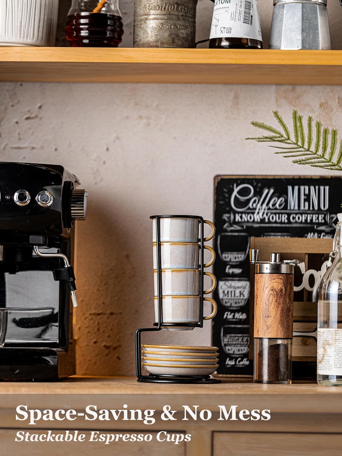 - STACKABLE & SAVE SPACE: Maximize counter space! These cappuccino cups stack inside of each other in the included metal rack, they are a breeze to store, making them ideal for small kitchens, coffee bars, or dorm rooms. Store vertically, save space!