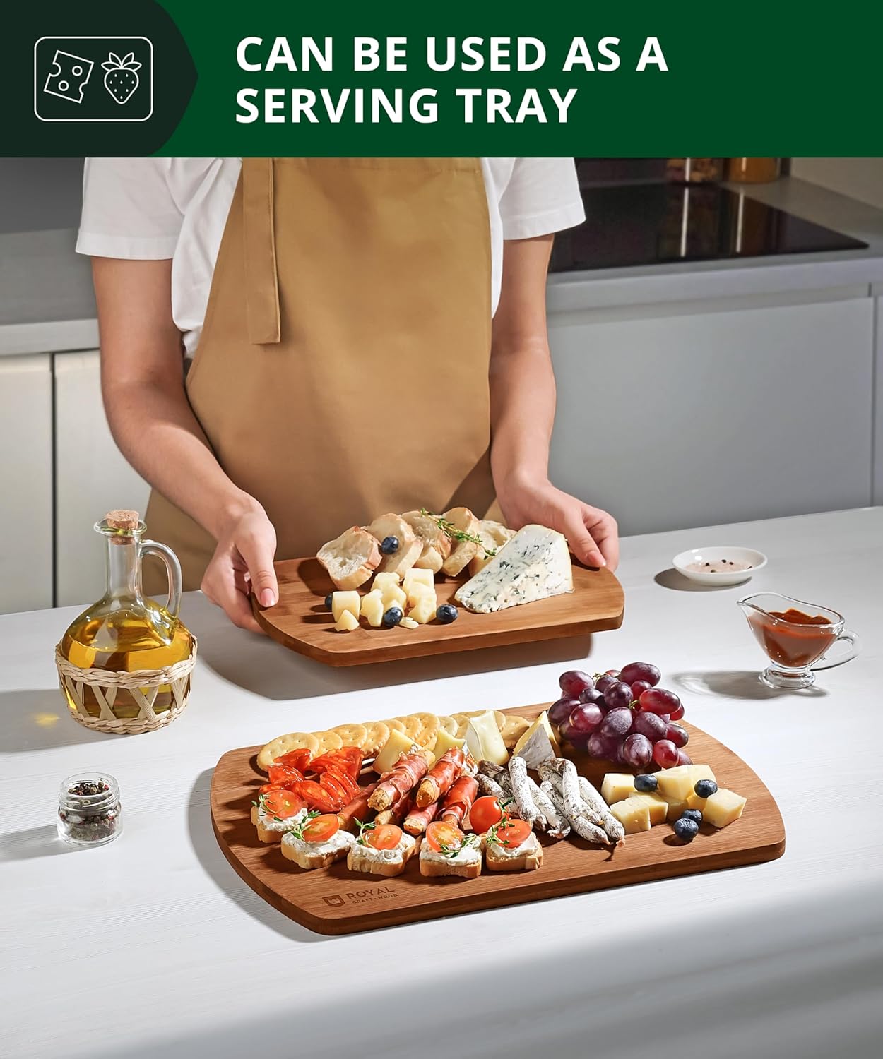 - πππππππ πππππππ ππππππ: Our newly designed 2 piece wood serving boards set is super slim & lightweight for easy use & maneuverability. The Royal Craft Wood bamboo chopping boards are available in 12βx8β, and 15βx10β options for your convenience, making this an all in one kitchen essential, allowing you to easily cut, meal prep, & even serve. Use the small board for quick fruit chopping, medium for multiple vegetables & large for slicing meat or for use as a charcuterie board.