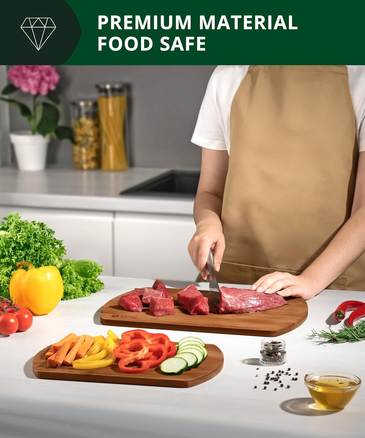 - πππ% πππππππππππ, πππππππ ππππππ πππππππππ: The Royal Craft Wooden Cutting Board Set, environmentally conscious in design, is made of premium, renewable bamboo & completely food safe for your peace of mind. Our bamboo serving board set is resistant to warping, splintering, or peeling. Featuring a beautiful wood grain design, they are perfect for charcuterie & other appetizer spreads. Easy to clean, hand wash under warm water with soap.