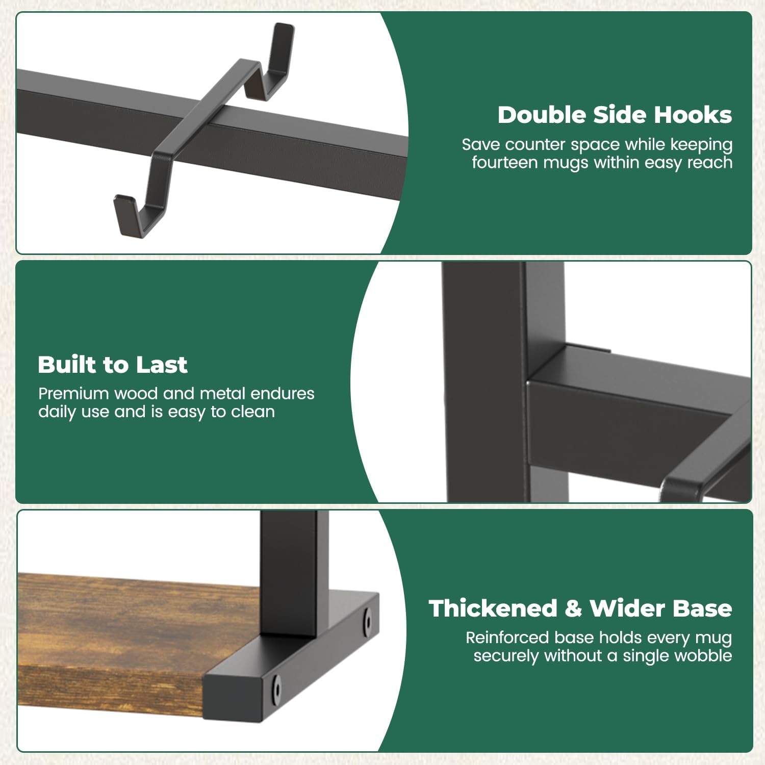 - Large Capacity Storage: Hold up to 14 mugs securely with this 2-tier mug rack while using the top and bottom narrow shelves for coffee bar accessories. Perfect for families and coffee lovers who need multifunctional storage in one stylish and practical stand