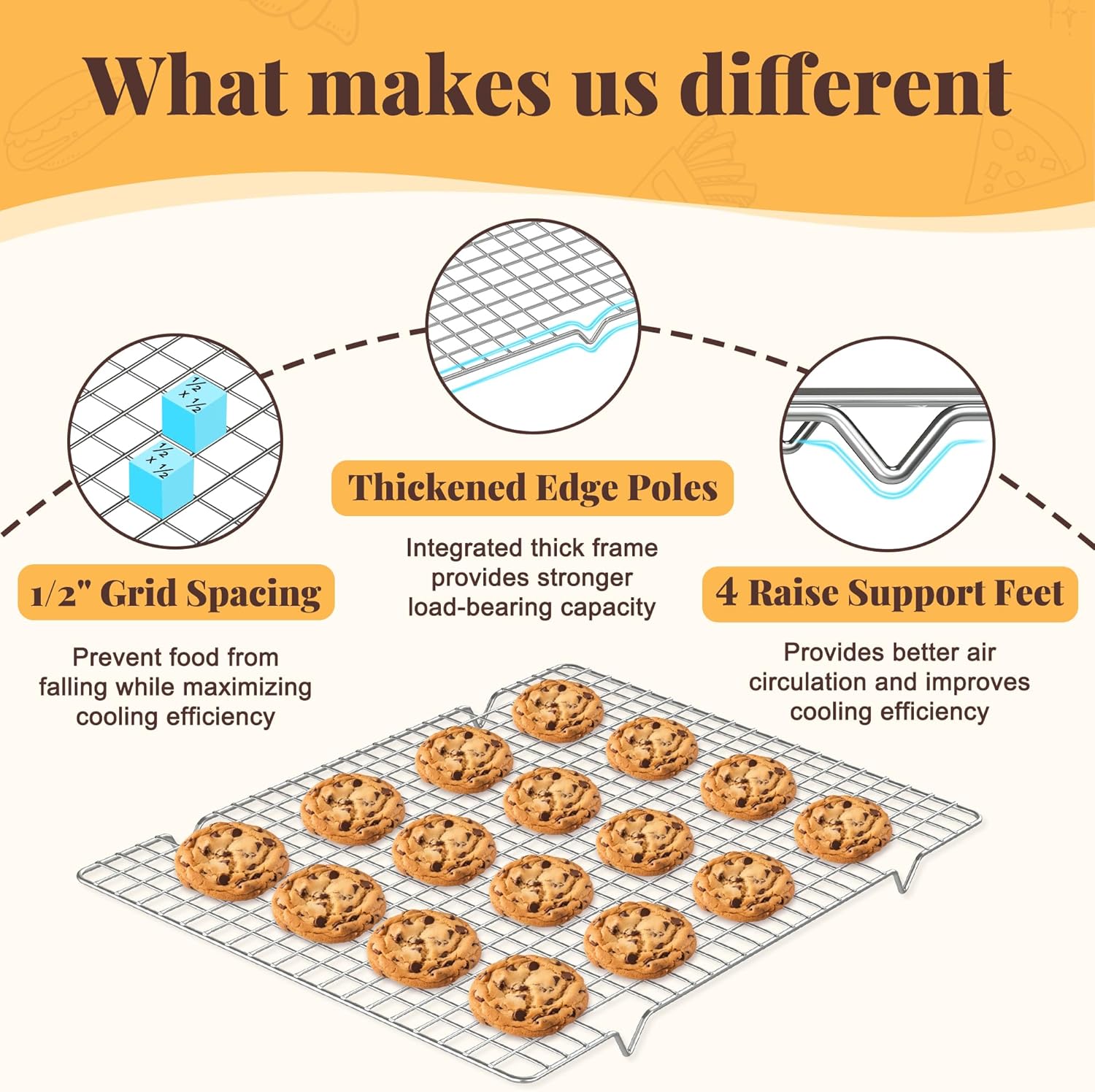 - INTEGRATED SUPPORT FEET: 4 strong support feet integrated with the frame, which can effectively provide load-bearing support and prevent the wire cooling rack for baking from shaking while improving air circulation and accelerating food cooling or draining