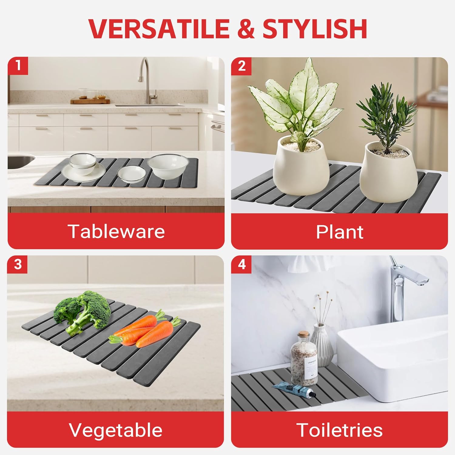 - [Multi scenario moisture-proof&versatile pad] Kitchen utensil drying,sink side tray, pet feeding mat, bathroom anti slip mat, laundry area water absorption and other multifunctional uses. Heat resistant materials can be used as temporary heat insulation pads for dining plates, with anti slip design to fix tableware without slipping meeting the needs of various damp scenes in the home and reducing the problem of dampness in the home