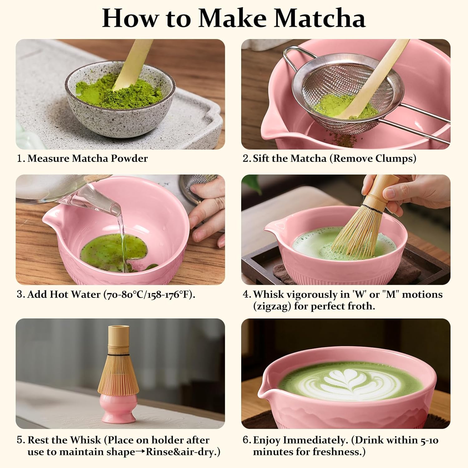 - 【Complete 7-Piece Matcha Set】 Our all-inclusive kit has everything you need: 1*17oz Ceramic Bowl (chawan), 1*Bamboo Whisk (Chasen), 1Stainless Steel Sifter, 1Bamboo Scoop (chashaku), 1Whisk Holder, 1Ceramic Spoon Rest, 1Tea Cloth (chakin), and 1User Manual. Elegantly packaged for an authentic matcha experience. (Matcha powder not included).