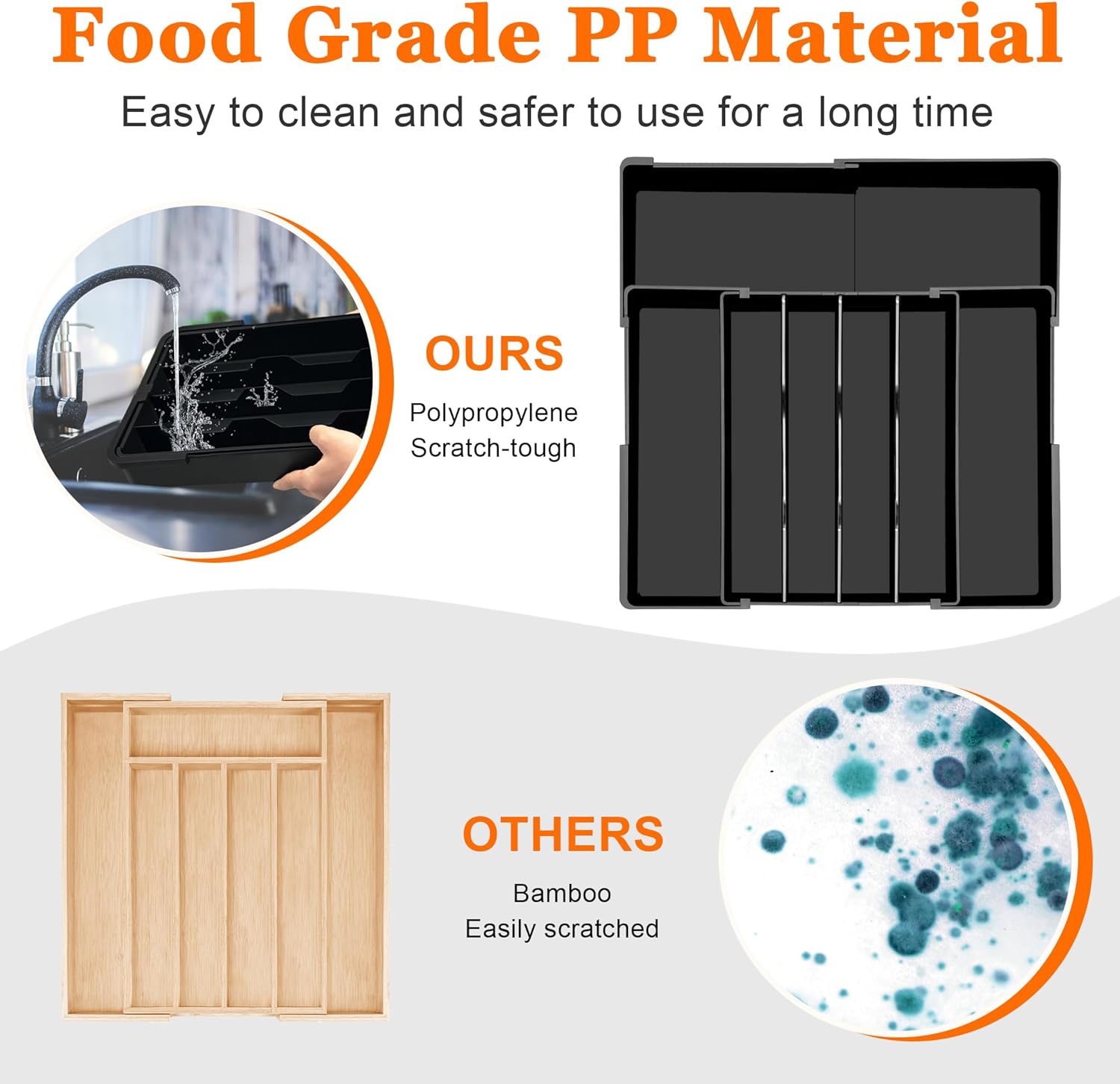 - ăPremium Food Grade Material for Safetyă: Crafted from thick, sturdy food-grade PP material, our utensil drawer organizer is built to last. Itâs also BPA-free, ensuring that your kitchen utensils stay safe for your familyâs health. Cleaning is a breezeâsimply rinse with water or wipe with a cloth. Just avoid the dishwasher to keep your flatware organizer for drawer in top condition!