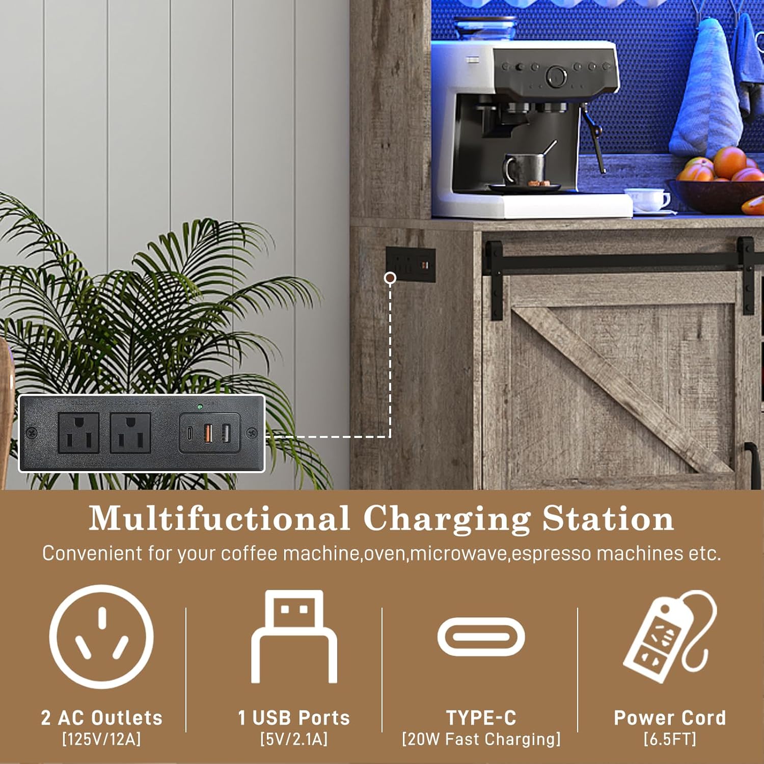 - ăConvenient Charging Socketsă The Coffee bar cabinets comes with a built-in power outlet, which features 2 AC plugs and 2 USB ports,1 type-c, powering up your essentials like ice-maker, coffee maker, wine fridge or microwave is a breeze. Elevate your space effortlessly â sip, relax, and enjoy!