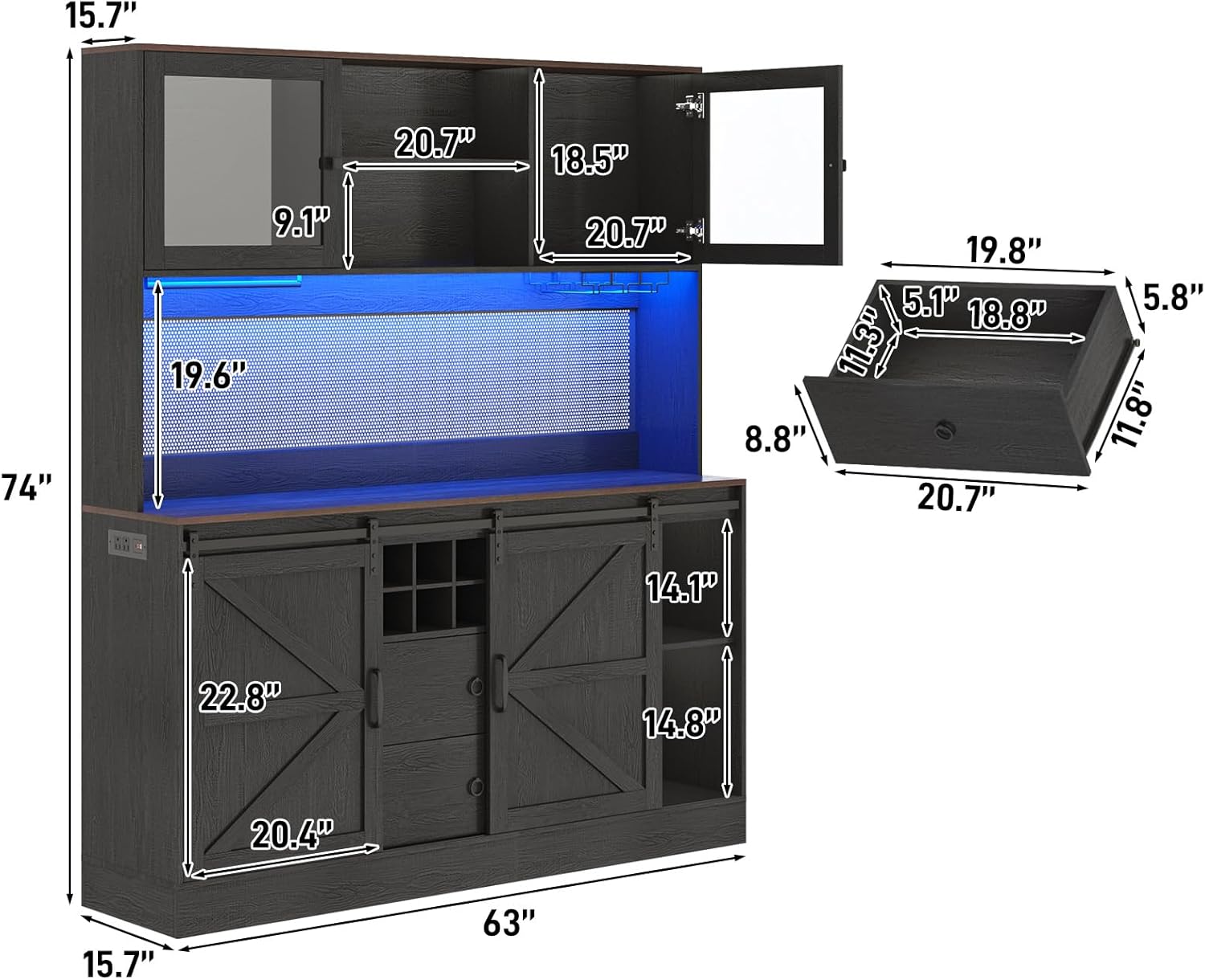 74" Tall 63" Wide Larg Bar Cabinet w/ Outlet,6000-color LED Light,Pegboard,Farmhouse Hutch Bar Cabinet w/Barn Door,2 Big Drawers,Adjustable Shelves,10 Wine & Glasses Rack,5 Hook for Kitchen,Black