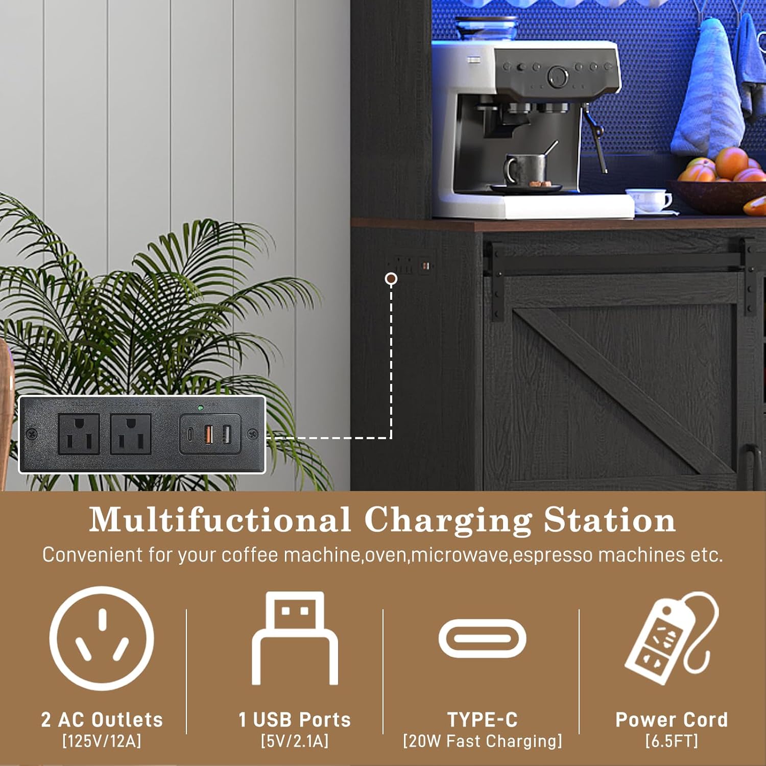 - ăConvenient Charging Socketsă The Coffee bar cabinets comes with a built-in power outlet, which features 2 AC plugs and 2 USB ports,1 type-c, powering up your essentials like ice-maker, coffee maker, wine fridge or microwave is a breeze. Elevate your space effortlessly â sip, relax, and enjoy!