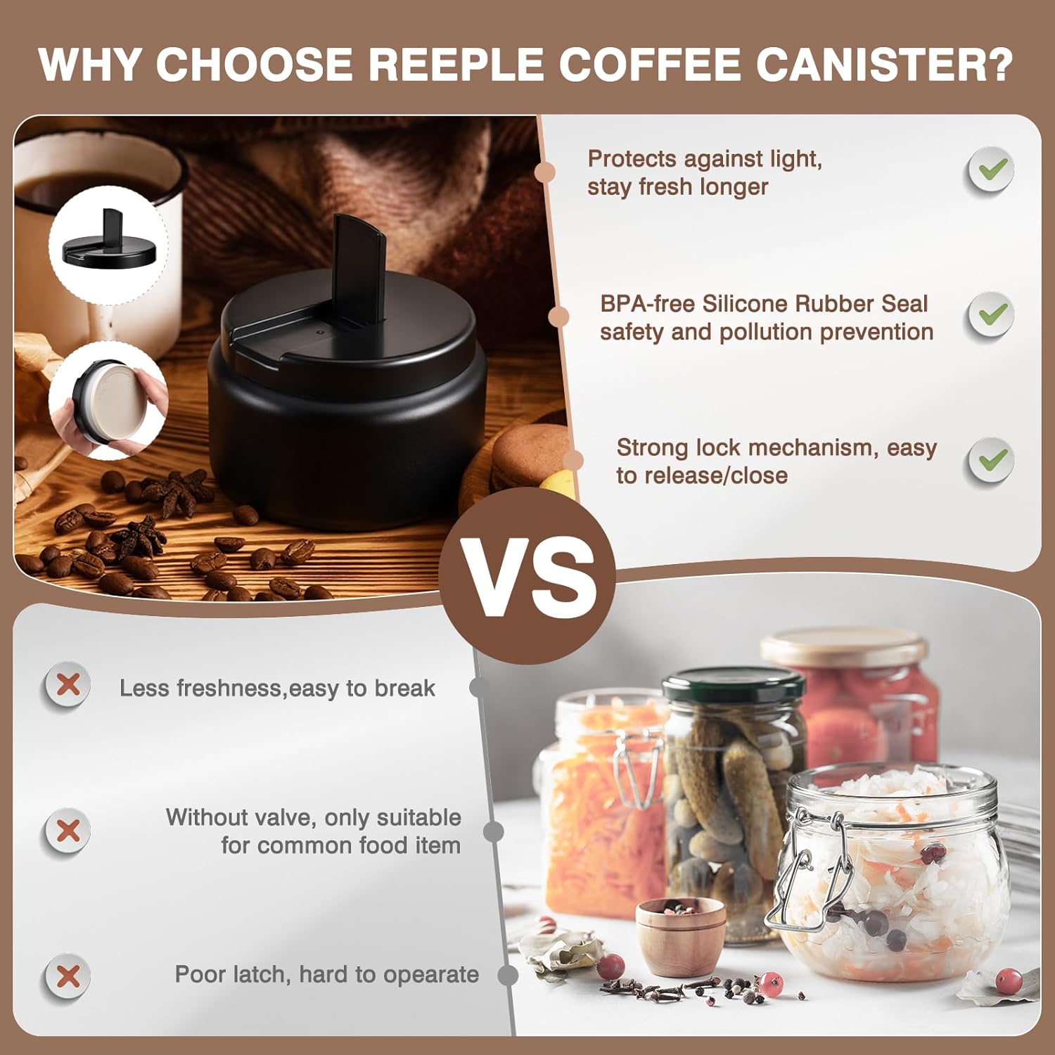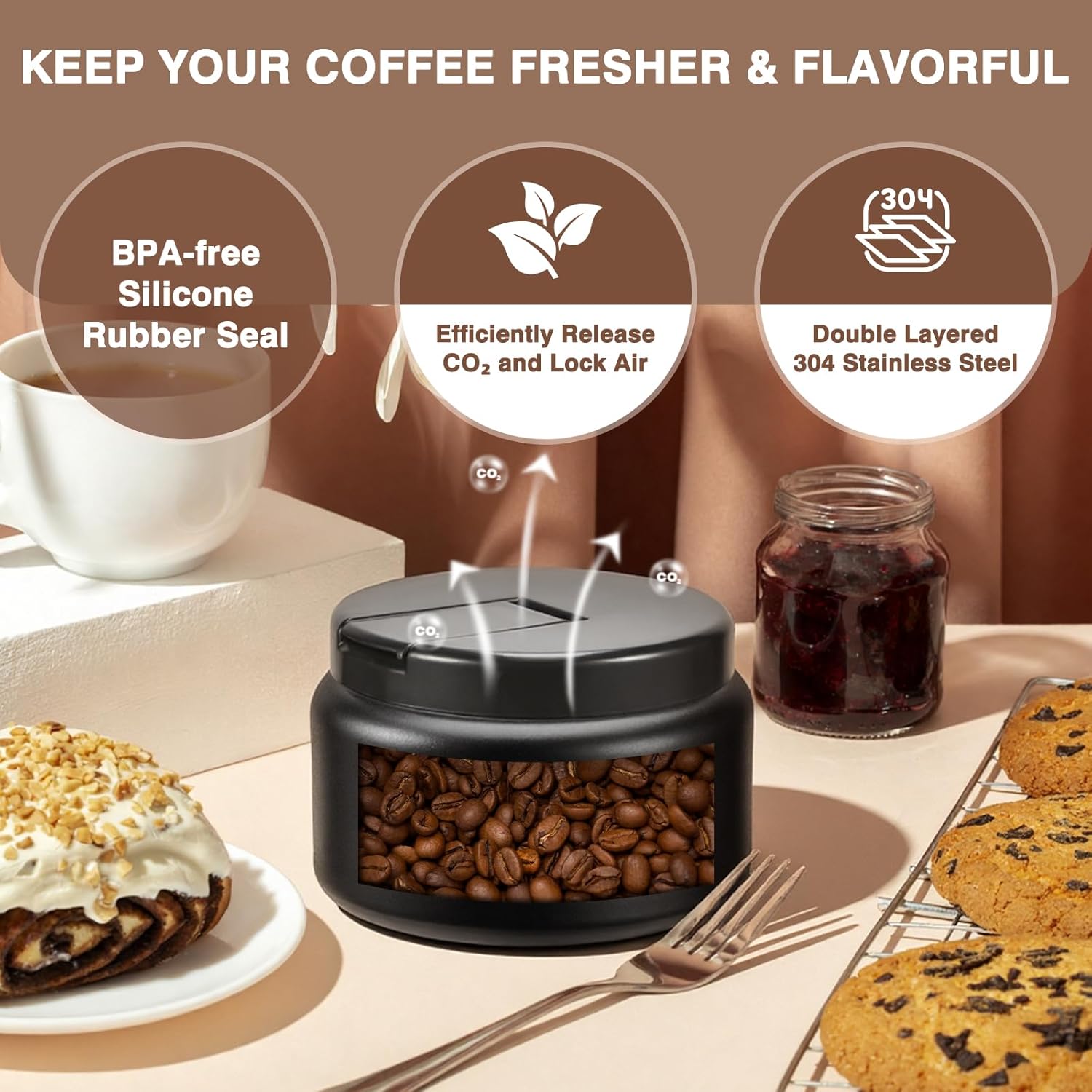 - 【Keep Coffee Fresher & Flavorful】Keep your coffee fresh and flavorful with our airtight coffee canister; featuring BPA-free silicone seal, it locks out air and prevents harmful oxidation; dark design protects coffee from light and moisture, ensuring every cup tastes freshly ground.