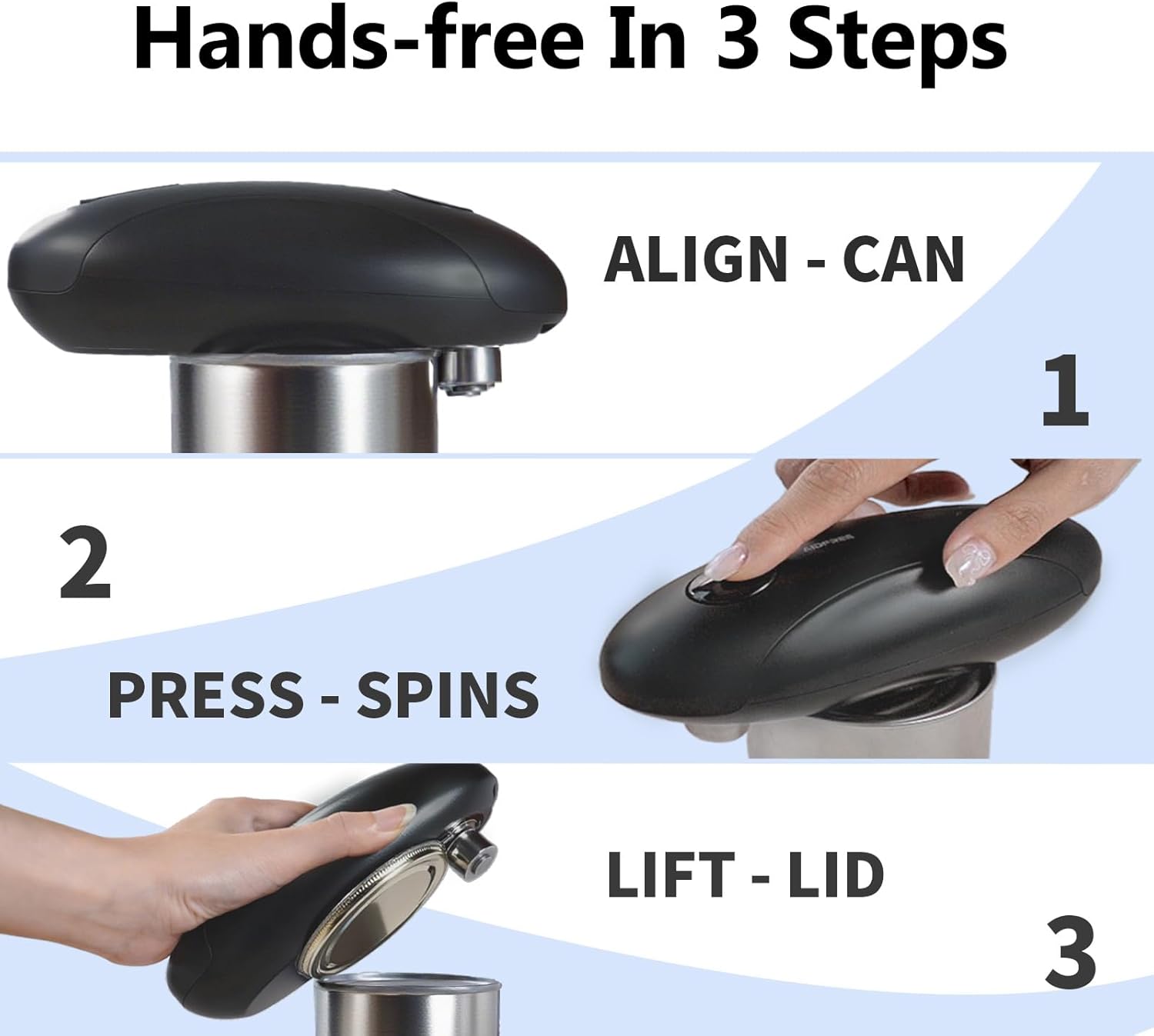 - One-Touch Simplicity:3 Steps easy to use Aidfree electric can opener;align, press, and relax;our sleek, high-tech design enables fast,stable,and whisper-quiet cutting cans with a single touch;No straining, no slipping—just effortless hands-free operation from start to finish