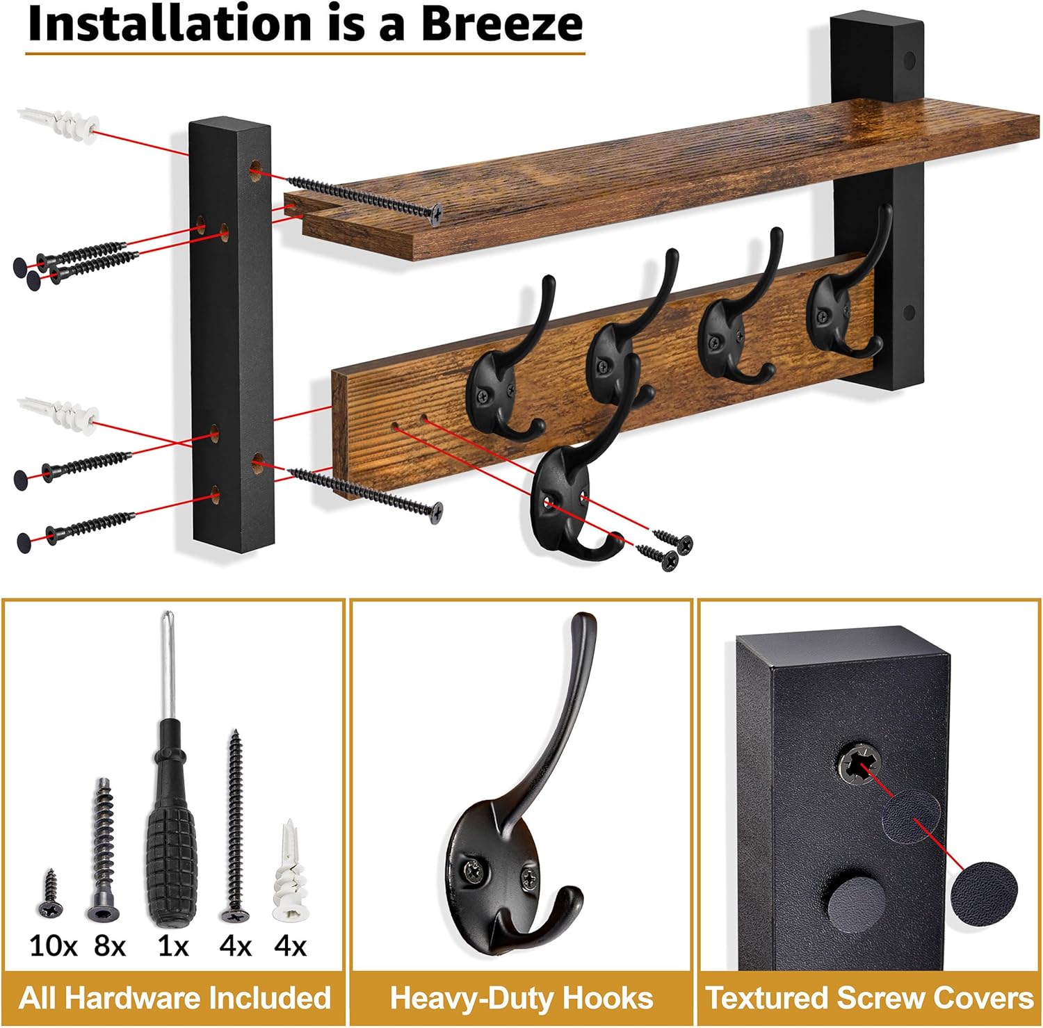 Sorbus Coat Hooks Wall Mount with Shelf – 24 Inch Coat Rack Wall Mount with 5 Heavy Duty Hooks – Floating Wall Shelf with Hooks for Entryway, Bathroom, Bedroom, Kitchen, or Mudroom (Rustic Brown)