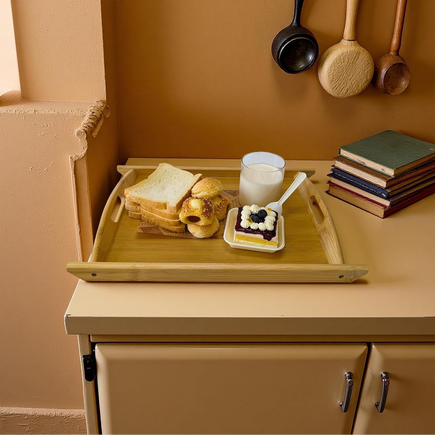 - RAISED EDGES AND HANDLES: It's elegant sides with wide handles design makes it more easy to grip and transport, allow for easy carrying of food from the kitchen to living room, patio, bedroom or bathroom; raised edge could prevent items from falling over, never worry about accidents.
