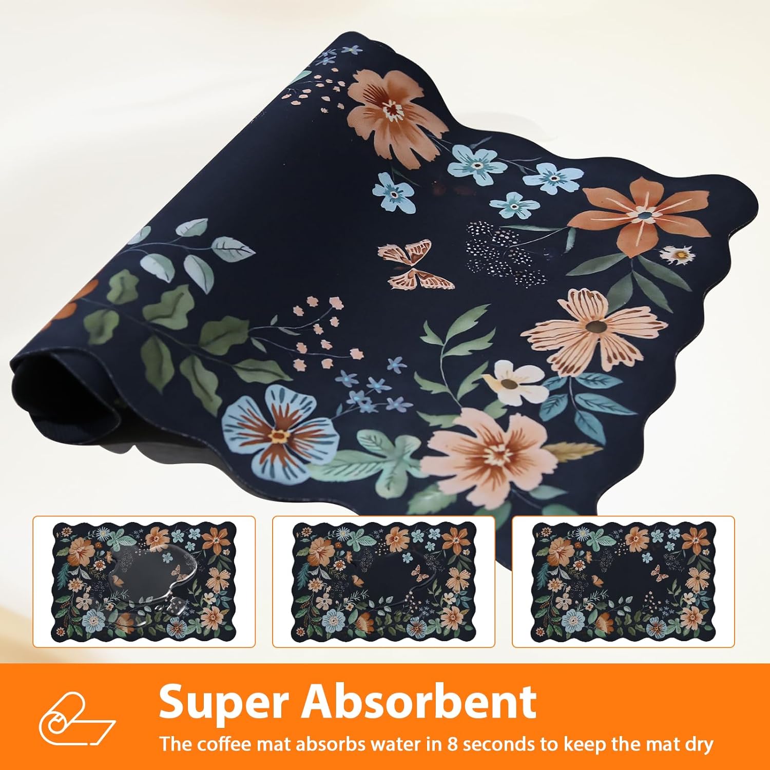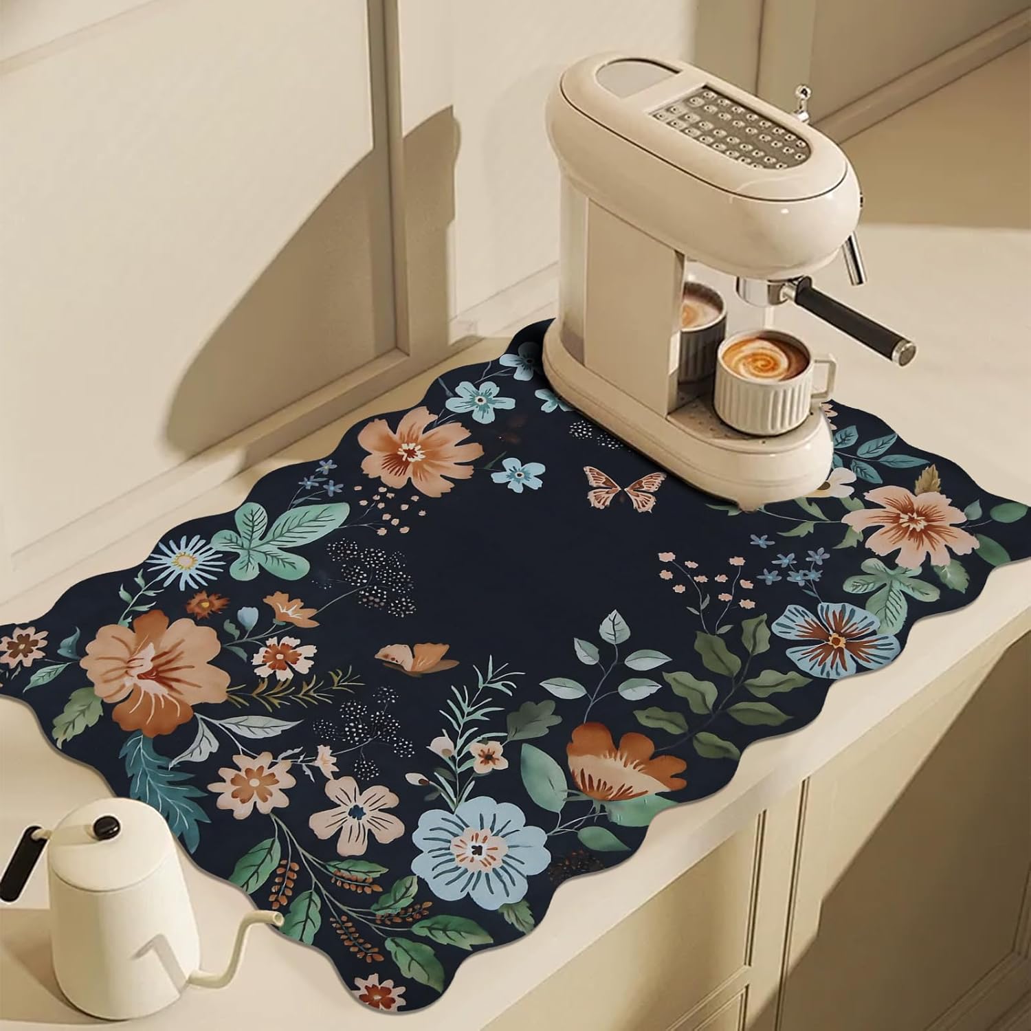 - Scalloped & Bohemian Floral Design:Our scalloped cute dish drying mat gives the best expression to the aesthetics. Cute, bohemian two styles in one. It can not only be used as a coffee mat, but also as a door mat, placemat, mouse pad, pet mat and even can be as a decoration for the kitchen and home, adding bright colors to your home. Pleae clean it according to our instruction in picture before using our scalloped dish drying mat