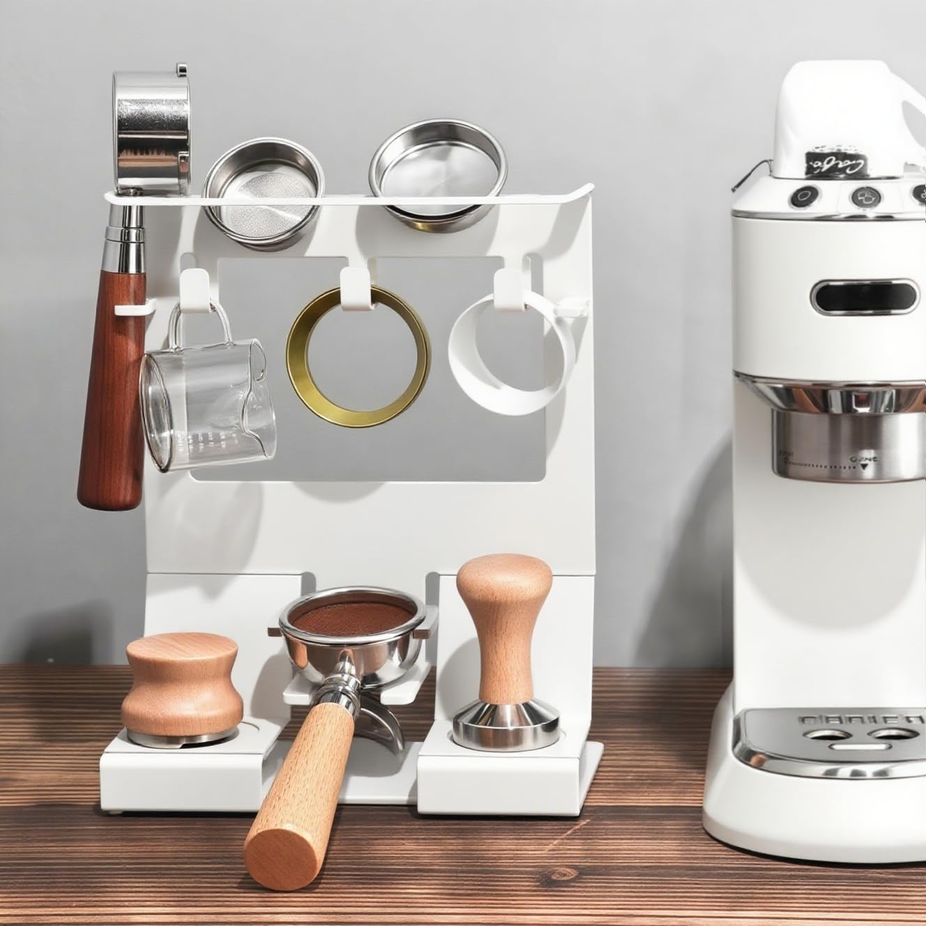 - 【Space-Saving & Dual Function】The compact vertical design maximizes countertop space while displaying your coffee gear in style. Not just for storage — the sturdy base also supports direct tamping for improved workflow. The stable structure and dedicated tamping area allow for quick and efficient workflow, all in one place.