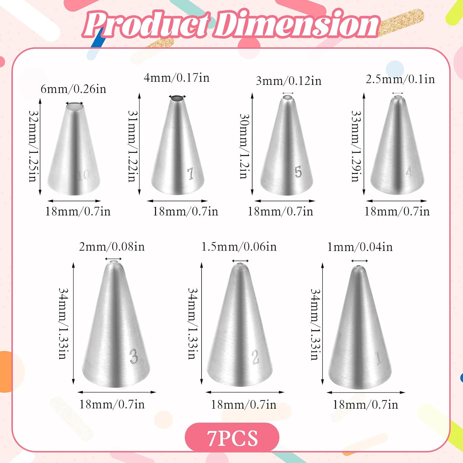 - 7 Sizes: This small round piping tips set includes 7 stainless steel frosting nozzles in 7 different sizes, perfect for creating a variety of designs on cakes and cookies from large designs to intricate details