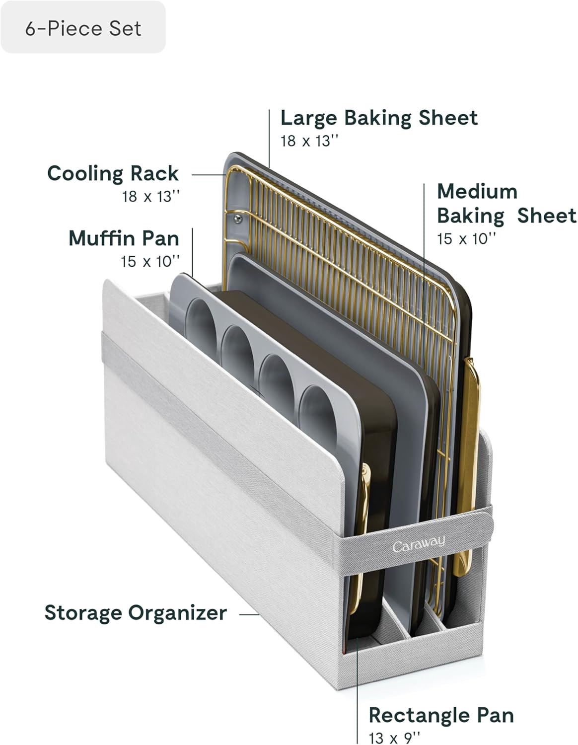 - WHAT'S IN THE BOX: Included in this 5-piece bakeware set is a 18x13" baking sheet, 10x15" baking sheet, 12 cup muffin pan, 9x13" rectangle pan, and 1 storage organizer.