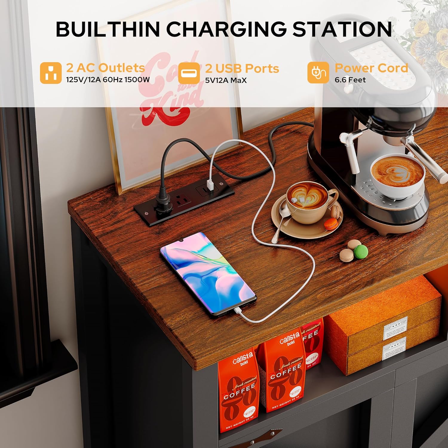 - Multi-Functional Integration - Buffet Cabinet with Charging Station: This Buffet Sideboard features a power outlet, which creates convenience for device charging. Led buffet cabinet has 2 AC outlets and 2 USB ports, so you can charge your coffee maker, microwave oven, bread machine, mobile phone and other small appliances without the need for an additional charger. That makes things so much easier for you if you don't have many outlets in your room.