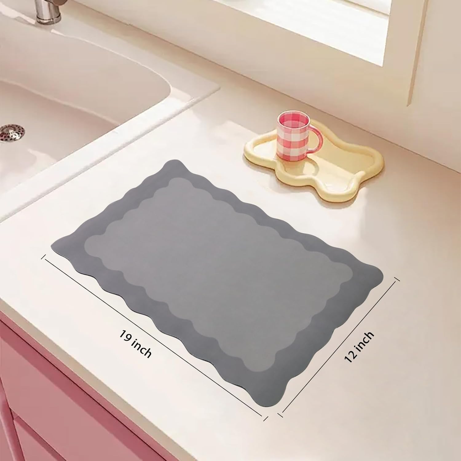 Scalloped Coffee Bar Mat for Countertop, Cute Dish Drying Mats for Kitchen Counter, Diatomite Absorbent Mat for Coffee Station, Kitchen Aesthetic Decor (12"x19", Grey)