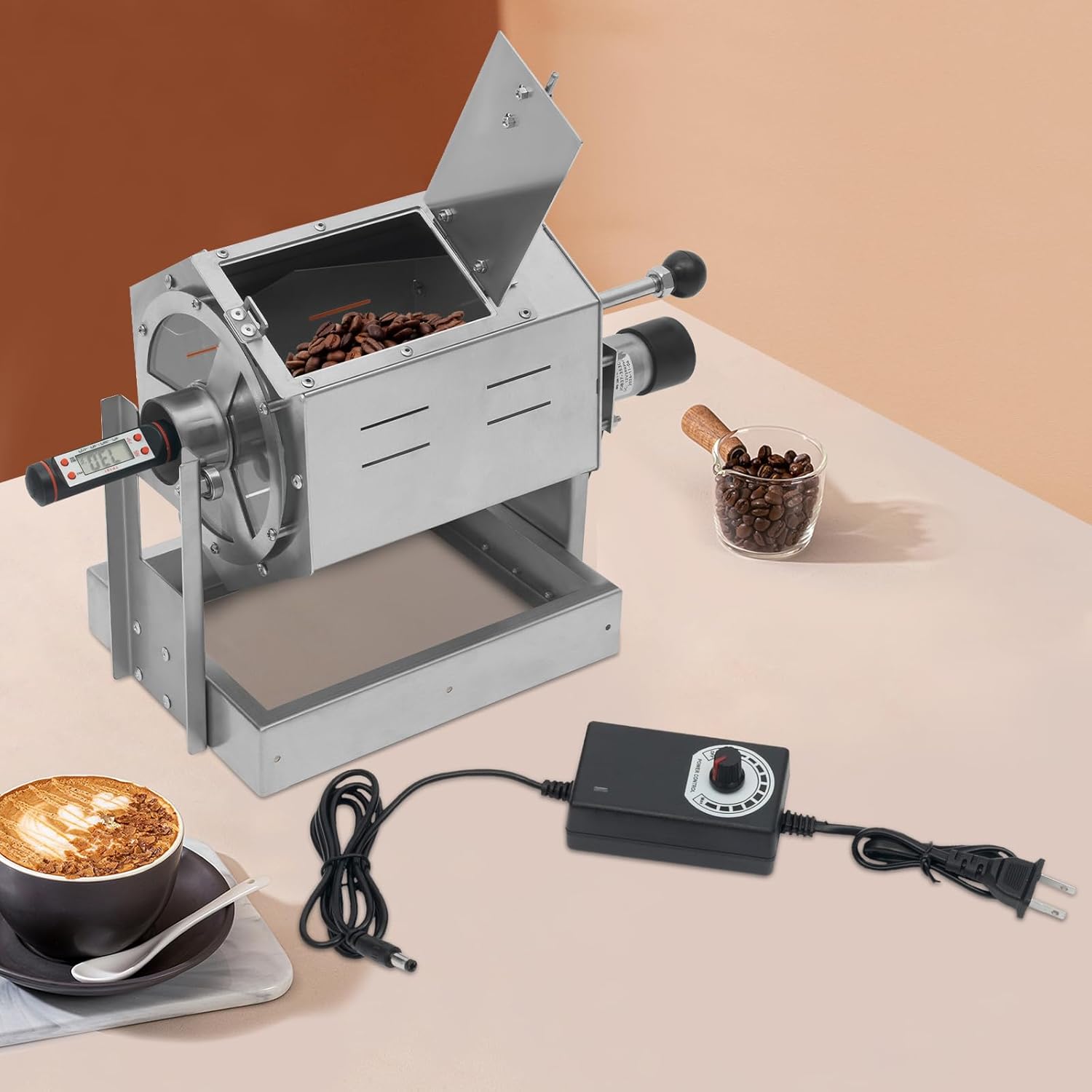 - ă0.66-2.65 LBS Large CapacityăThis drum-style coffee bean roaster can roast approximately 0.66-2.65 lbs(300-1200 g) of coffee beans, peanuts, nuts, soybeans, walnuts, sunflower seeds, kernels, rice, millet, pine nuts, and more in a single batch. Its generous capacity minimizes the need for frequent refilling, making it ideal for both commercial and home use