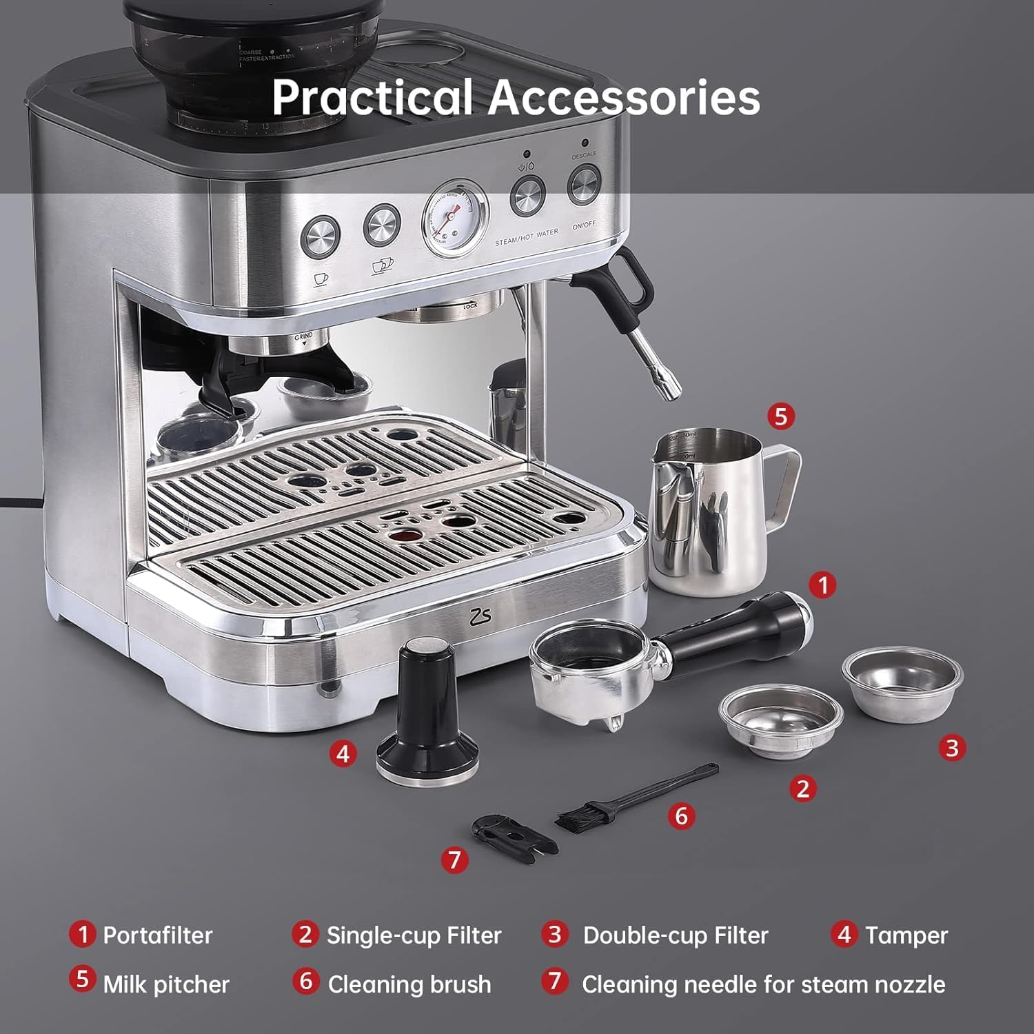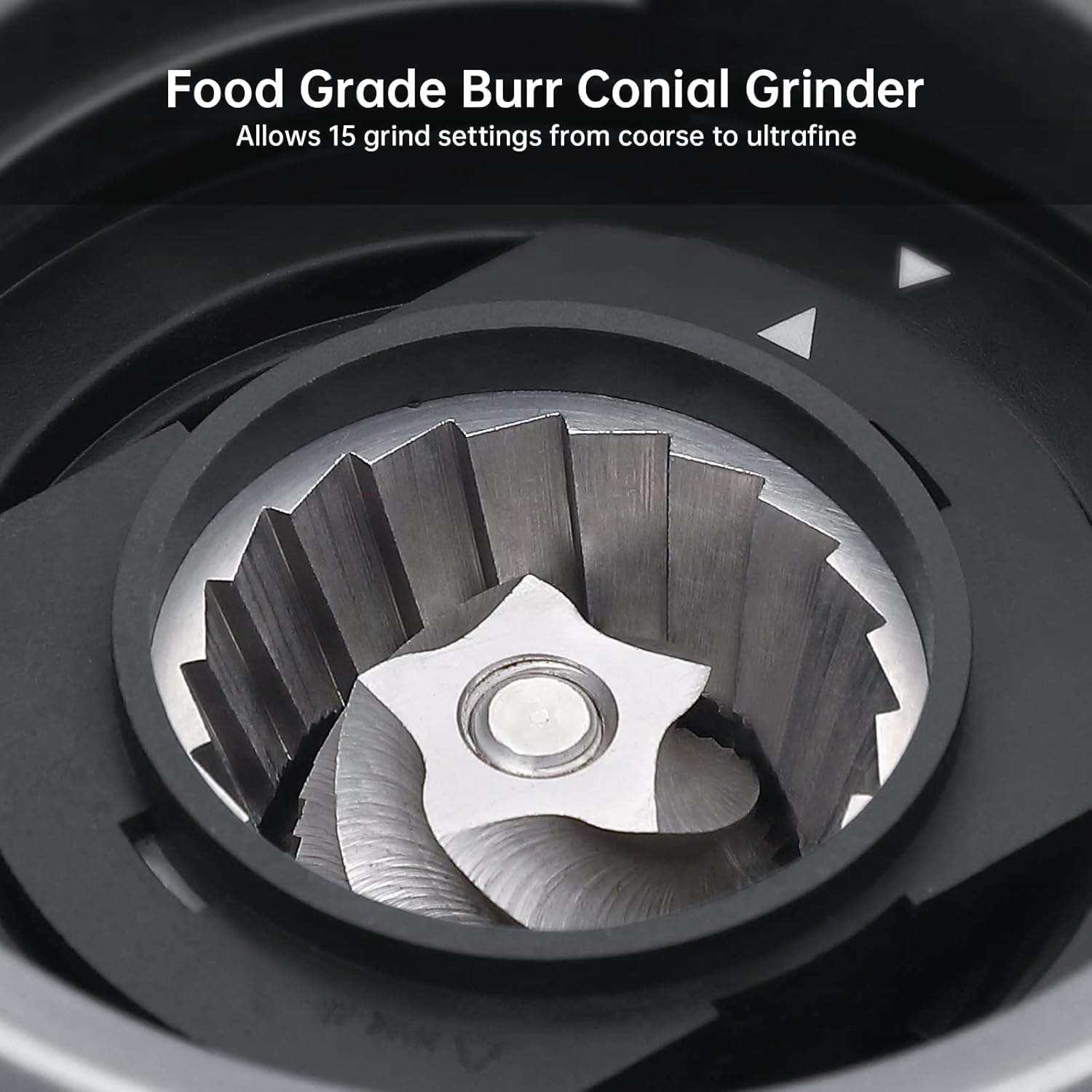 - 【Professional Espresso Machine with Grinder】This espresso machine with grinder features a food-grade stainless steel conical burr blade (better than flat blades) for even grinding, reducing flavor oxidation. It has a 250g bean compartment and 15 adjustable grinding levels, adapting to needs from delicate espresso to coarse press pots. Enjoy "one cup, one grind" freshness, replicating pro coffee shop flavor at home.