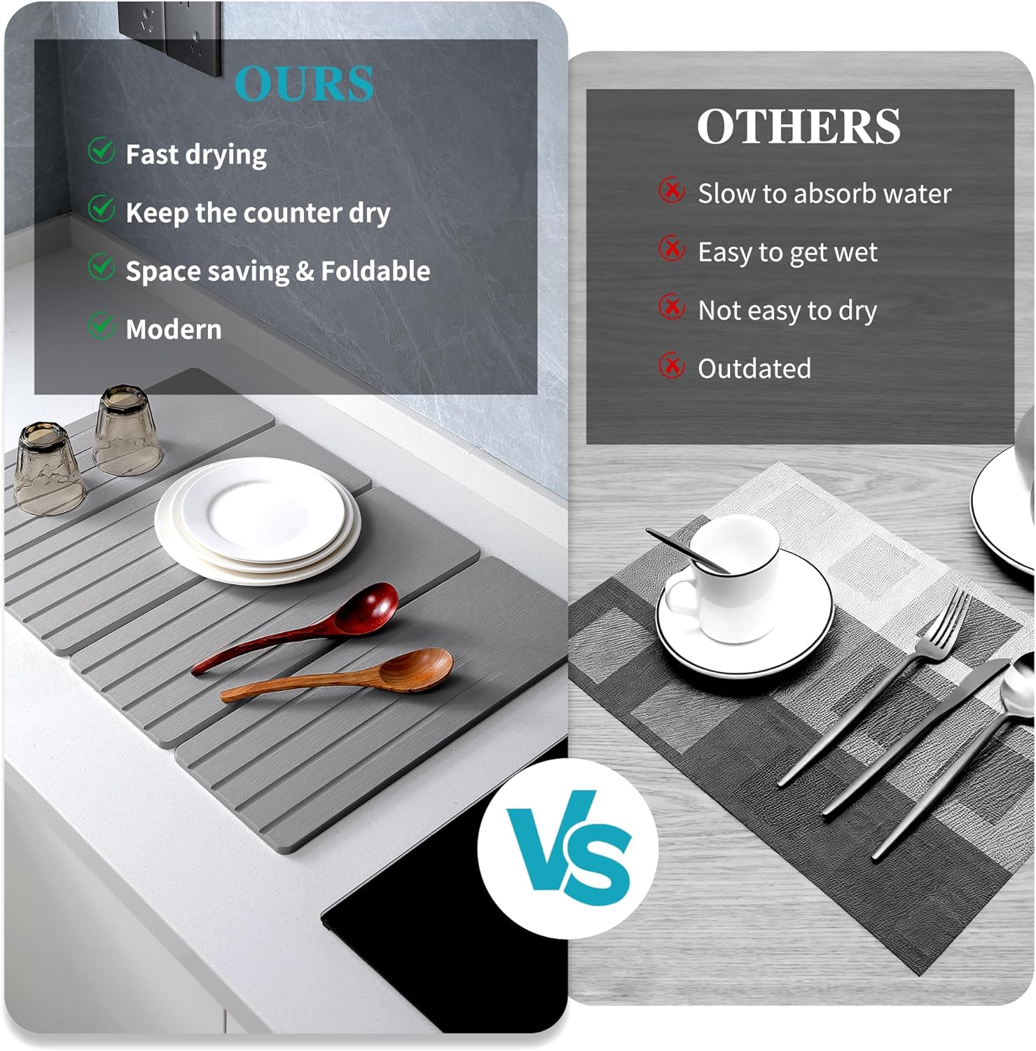 - Collapsible and Space-Saving: Measuring 23.62x15.35'' when unfolded, this collapsible stone drying mat offers ample space for your dishes. When not in use, easily store it in drawers or kitchen cabinets, maximizing your kitchen's organization