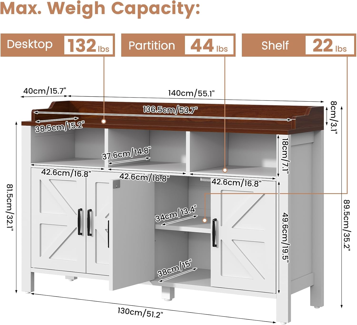 - ăHigher Weight Capacity UP TO 302 IbsăAn Special Metal Adiustable Support Leg is directly under the center of the sideboard buffet cabinet with storage. The fifth leg can stably support the buffet, largely avoiding the shelves from bending and shaking! So our countertop and each shelf can support up to 302Ibs, 68Ibs separately!